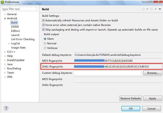 在弹出的 Build 对话框中 “SHA1 fingerprint” 中的值即为 Android 签名证书的 Sha1 值,如图所示: