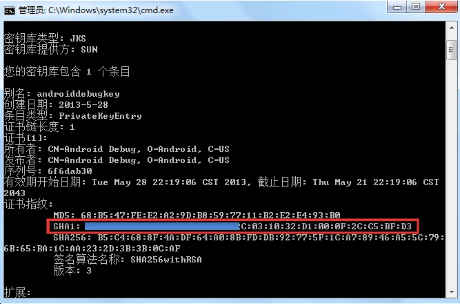 输入密钥后回车(如果没设置密码,可直接回车),此时可在控制台显示的信息中获取 SHA1 值,keystore 文件为 Android 签名证书文件。