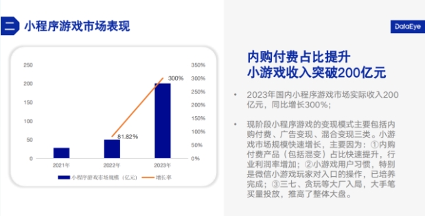 破局的关键在于小游戏。《2023 年中国游戏产业报告》指出,2023 年国内小程序游戏市场实际收入为 200 亿元,同比增长 300%。活跃用户数量同样惊人,2023 年上半年微信小游戏用户总量已突破 10 亿,月活用户达 4 亿。