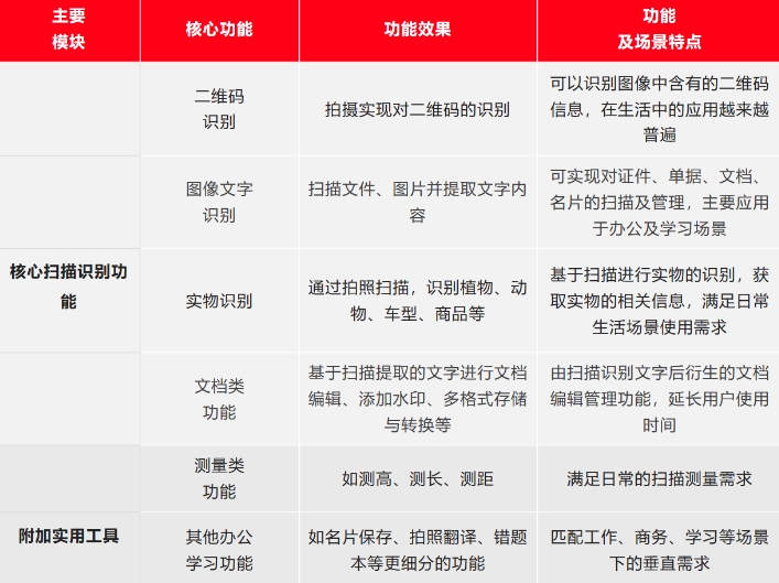 扫描类应用以扫描、识别、图像处理等功能作为核心,同时附带文档编辑管理、格式转换、多终端同步等增值功能,以满足办公、学习、生活中的移动扫描需要。