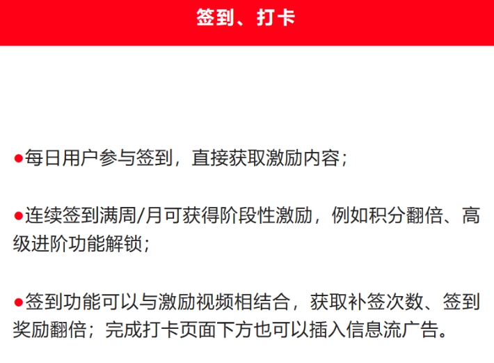 结合产品激励体系进行设置,例如用户可主动选择短视频广告来获得金币/红包奖励、补签到、使签到奖励翻倍等。